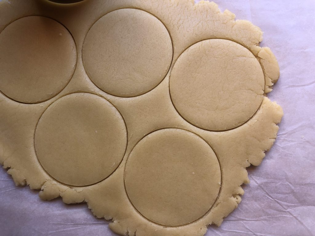 Una vez extendido el bloque de masa después del reposo en la nevera, cortar círculos con un cortapastas (o un vaso) de 7 cm de diámetro. Colocarlos poco a poco en la bandeja forrada con papel de horno. Volver a amasar los restos y extenderlos hasta agotar la masa.