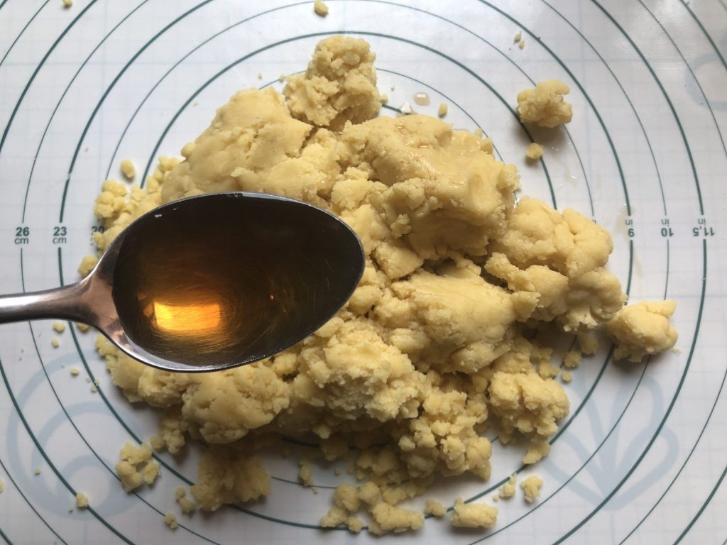 En este punto, comienza a añadir la harina tamizándola junto con la vainillina a través de un colador de malla fina y trabaja la masa dentro del cuenco. Si la masa está demasiado desmenuzada, añade un poco de clara; diría que procede una cucharada a la vez. Esto puede depender de la calidad de la harina.