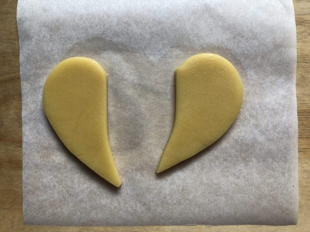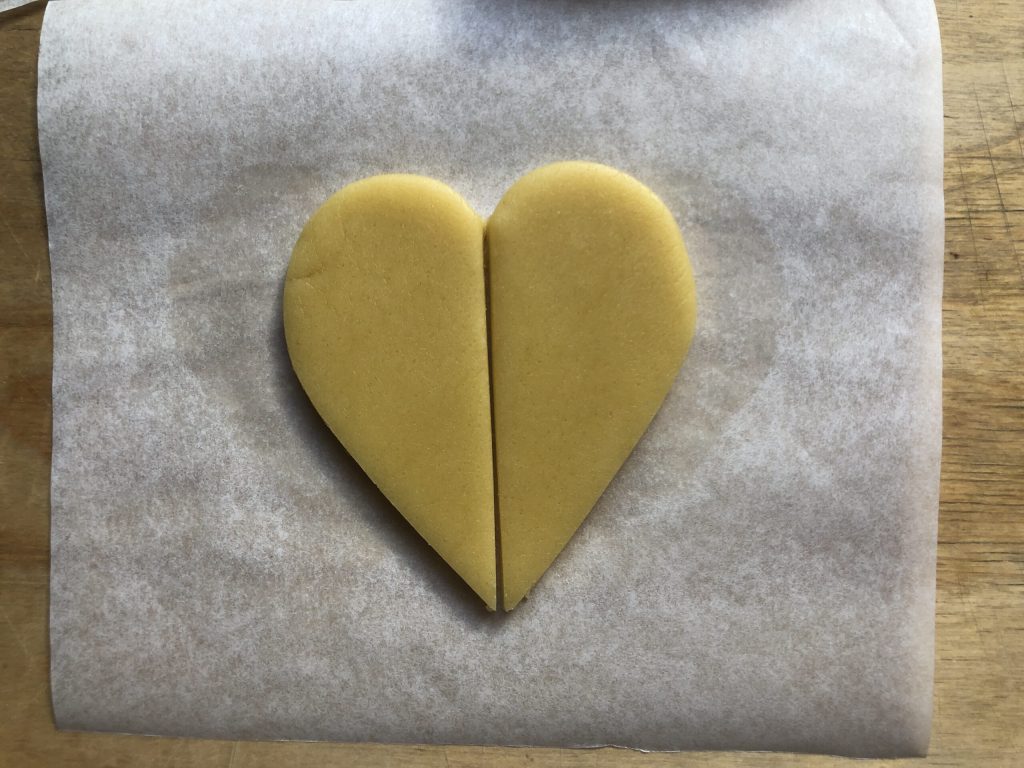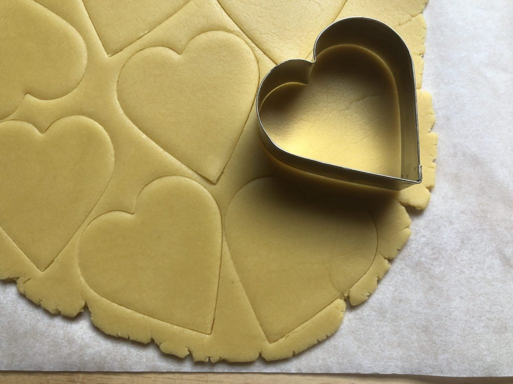 Luego, corta corazones con un molde de 8 cm. Vuelve a amasar los recortes y extiéndelos hasta agotar la masa.