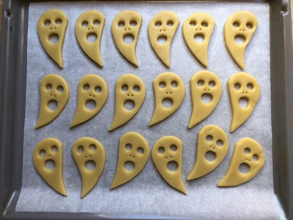 Separa las dos partes y empuja ligeramente hacia el interior las dos puntas para crear la forma del fantasma. Transfiérelas poco a poco a la bandeja forrada con papel para hornear.