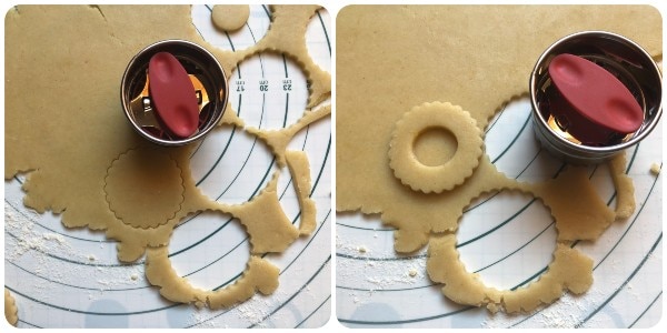 • Colocar las bases en una bandeja cubierta con papel de horno. Poner en el centro un montoncito de crema de avellanas (u otro relleno) y cerrar con la galleta agujereada.