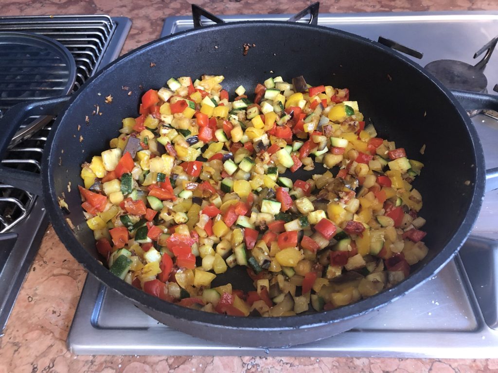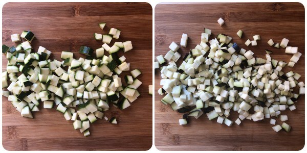 • Cortar los extremos del calabacín y la media berenjena, lavarlos y cortarlos también en dados.
