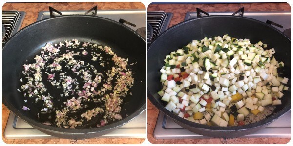 • En una cazuela grande, calentar unas cucharadas de aceite antes de añadir la chalota. Dejarla chisporrotear por un momento, luego añadir todas las verduras.