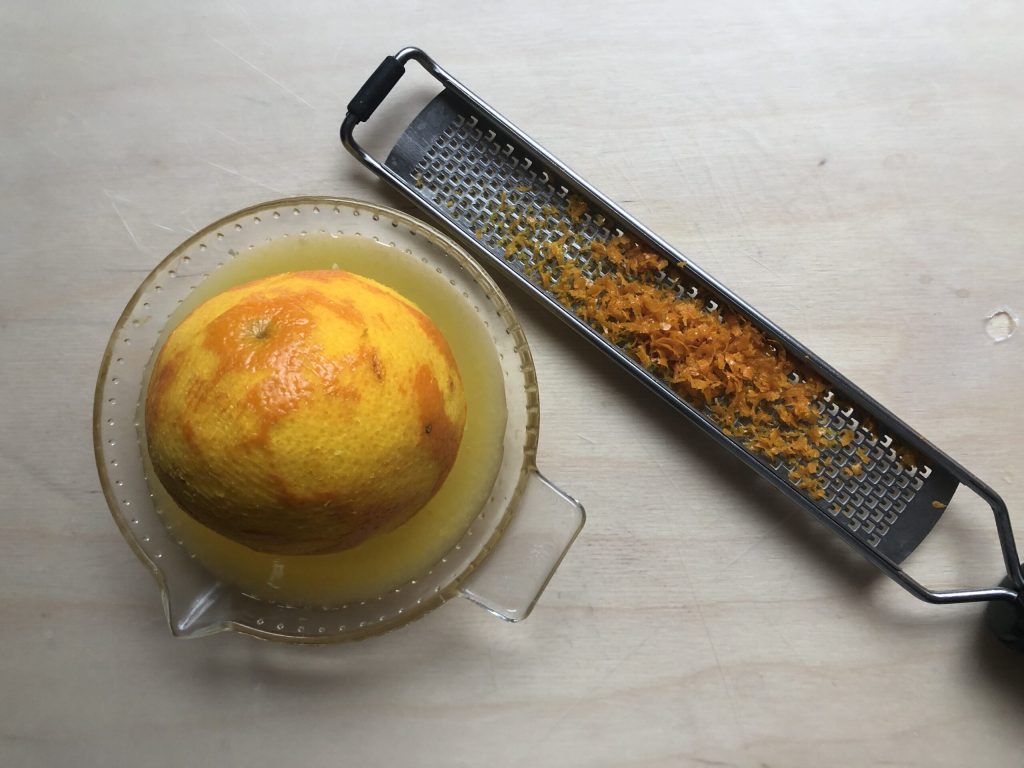 Lavar muy bien la naranja, secarla y extraer la cáscara con un rallador para cítricos antes de exprimir 20 ml de jugo.