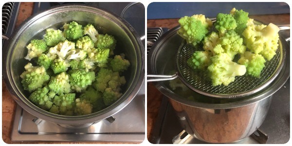 Eliminar las hojas del brócoli romanesco, lavarlo bien bajo agua corriente y dividirlo en floretes.