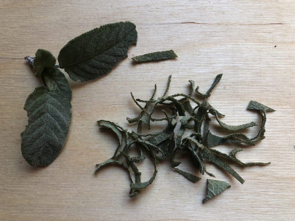 Lavar las hojas de salvia, secarlas con papel de cocina y cortarlas en tiras finas con las tijeras. Reservar.