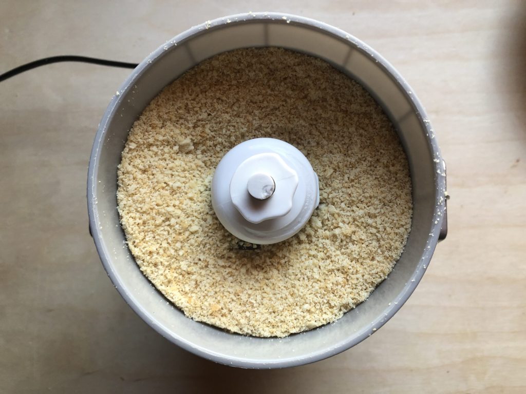 Poner el pan (sin corteza) en una picadora junto con el diente de ajo pelado y picar.