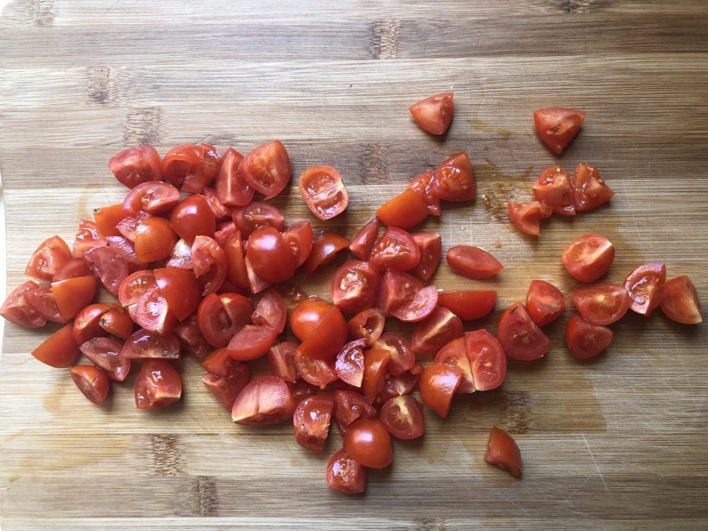 Lavar los tomatitos cherry, secarlos con papel de cocina y cortarlos en trozos.