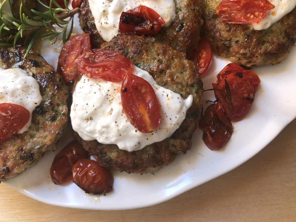 Hoy os propongo unas hamburguesas de pollo sabrosas y muy apetitosas además de fáciles de preparar. Contienen rúcula y alcaparras en su mezcla y se sirven con burrata y tomatitos. Os dejo imaginar el resultado.