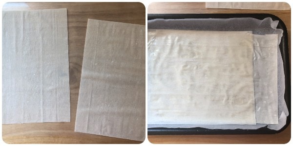Repetir la misma operación con otras dos hojas. En total, la base estará constituida por tres hojas de pasta filo todas pinceladas con agua.