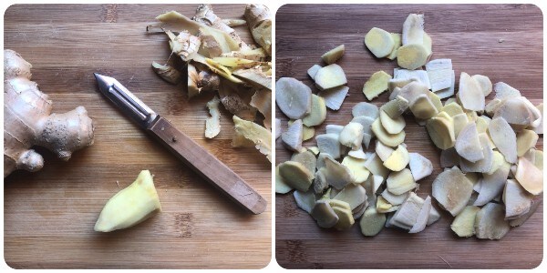 Limpiar el jengibre fresco ayudándose con un cuchillito o con un pelador de patatas y cortarlo en rodajas finas.
