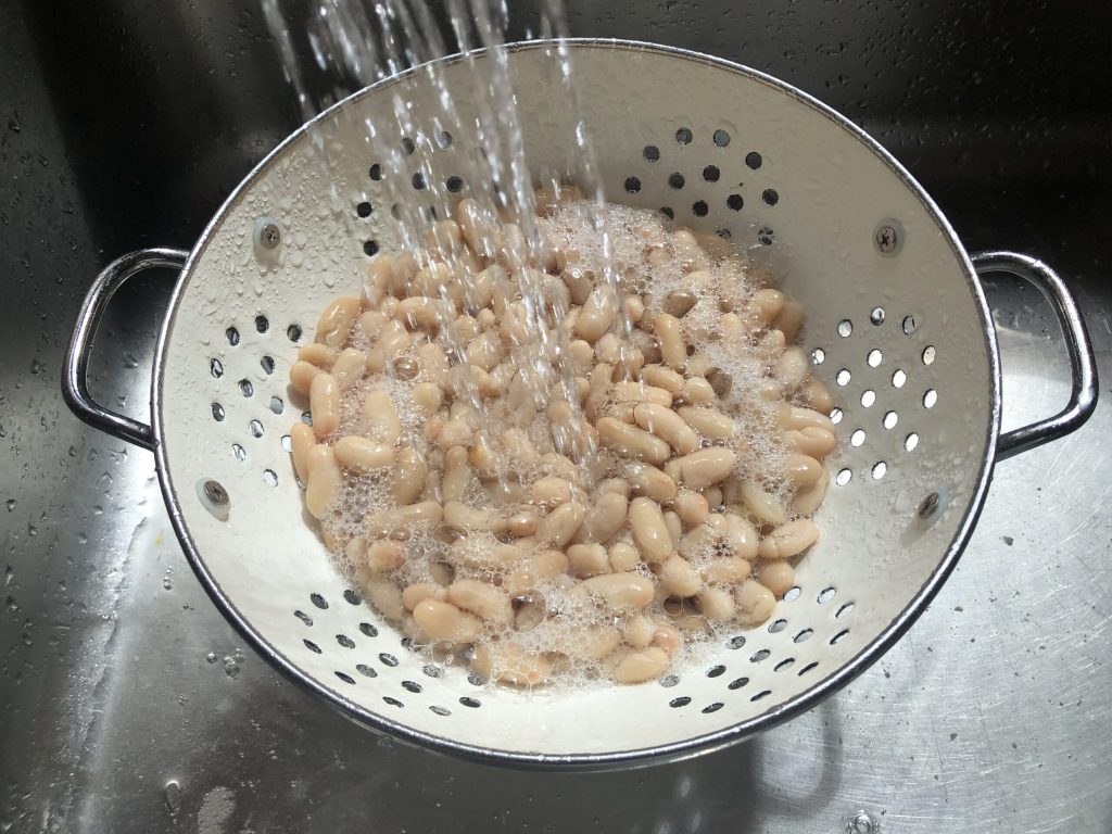 Escurrir las judías cannellini del líquido en el que están conservadas y enjuagarlas bien bajo agua corriente.