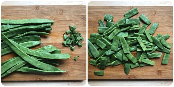 Quitar las puntas de las judías verdes anchas, lavarlas bien bajo agua corriente y cortarlas en trozos.