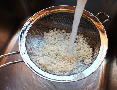 Enjuagar bien el arroz bajo agua corriente para eliminar parte del almidón.