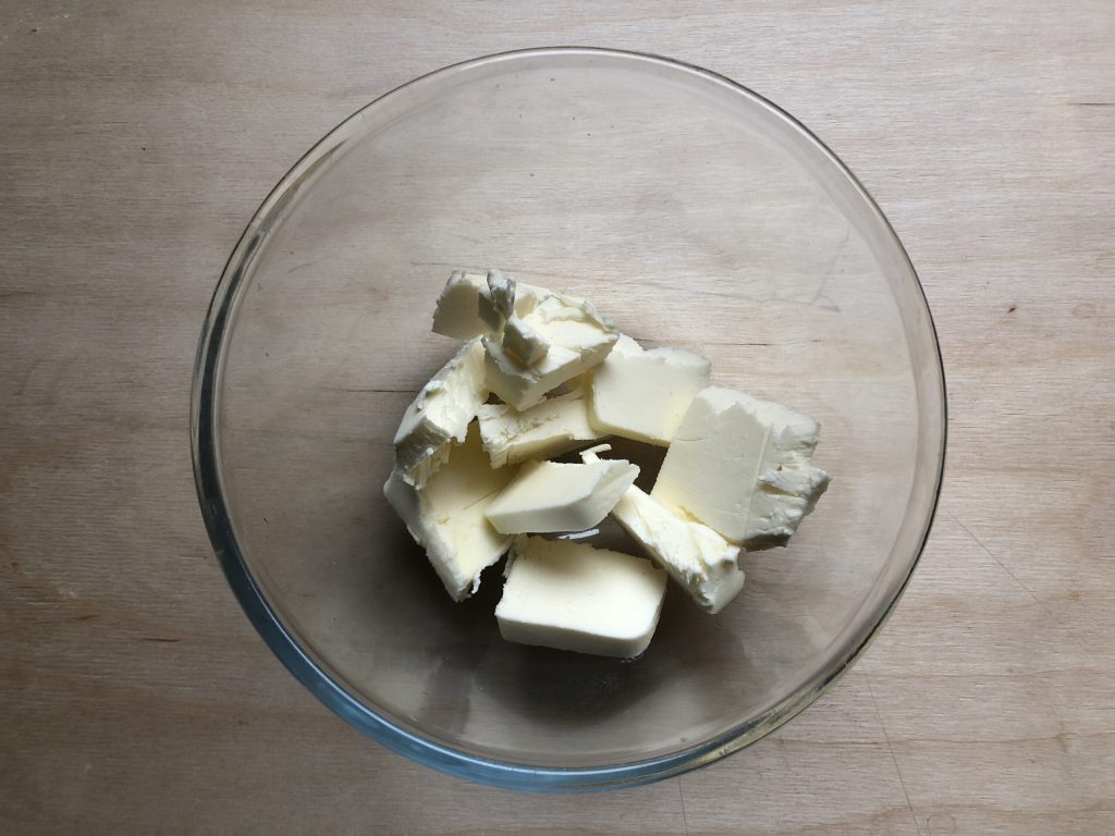 • Poner la mantequilla en trozos en un bol y dejarla ablandar a temperatura ambiente o pasarla por unos pocos segundos en el microondas. No debe derretirse en absoluto, solo ablandarse ligeramente.