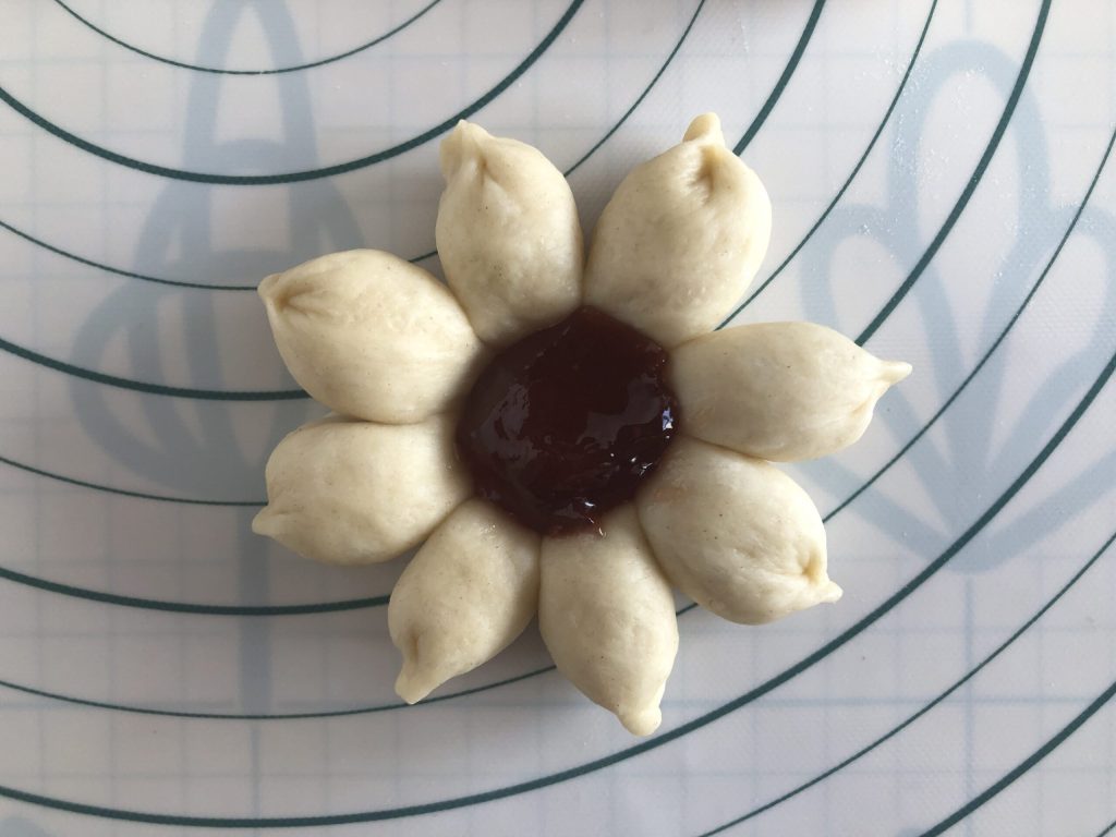 Hacer ocho cortes en la masa exterior, luego quitar el vasito y pellizcar cada «pétalo» como se muestra en la fotografía.
