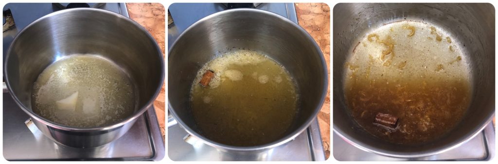 En un cazo, derretir la mantequilla, luego añadir un trozo de canela y tres cucharadas de miel.