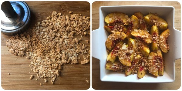 Machacar los amaretti (yo usé un mazo, pero también sirve un vaso) y espolvorearlos sobre los melocotones.