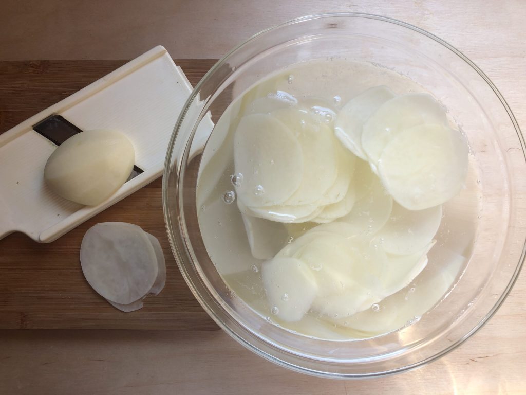 Pelar las patatas, lavarlas bien y cortarlas en rodajas muy finas con una mandolina. Ponerlas poco a poco en un bol grande lleno de agua fría para que pierdan parte de su almidón y sobre todo para que no se oscurezcan.