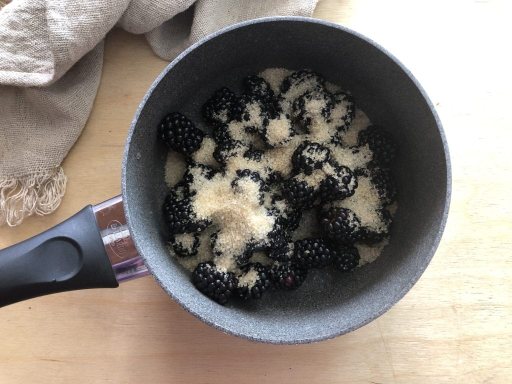 Llevar al fuego y cocinar a fuego medio-bajo durante 6/7 minutos, removiendo a menudo. Una vez cocidas, las moras deben estar muy blandas, prácticamente deshechas. Apagar el fuego y dejar enfriar.