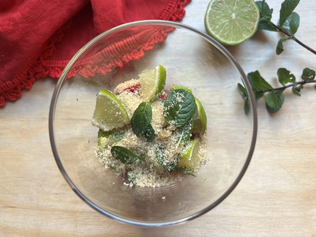 Con un mazo (o con el dorso de una cuchara) aplastad suavemente todo: así las hojas de menta liberarán sus aceites esenciales.