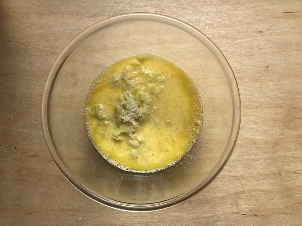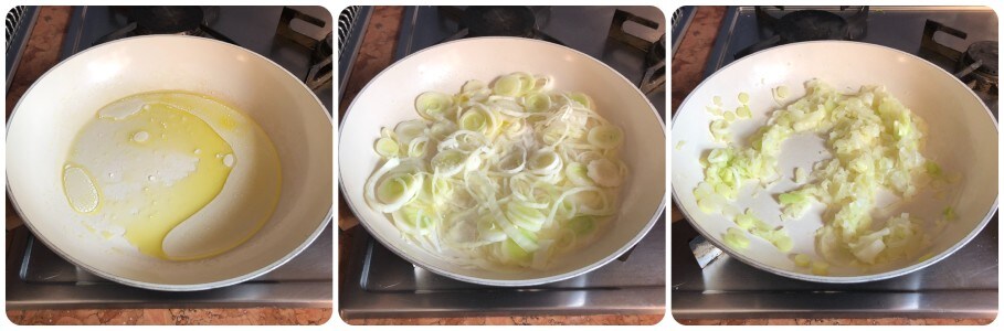 En una sartén, calentar un poco de aceite y un par de cucharadas de agua antes de añadir el puerro y una pizca de sal. Rehogar durante cinco minutos a fuego medio-bajo, removiendo de vez en cuando.