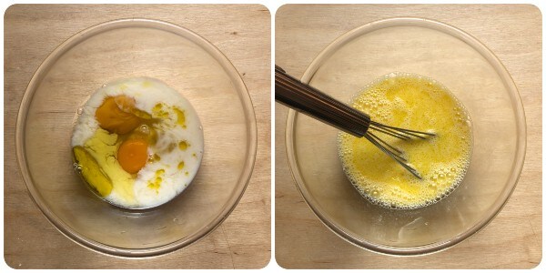 Romper los huevos en un segundo cuenco, añadir una cucharada de aceite (6 ml), la leche y mezclar con un pequeño batidor de mano.