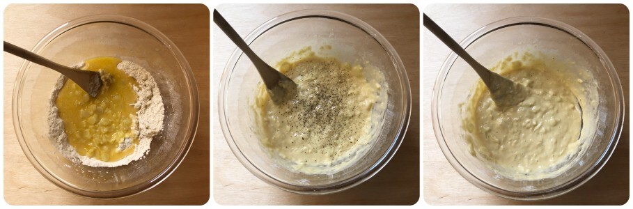 Verter la masa húmeda en el cuenco de la harina y mezclar enérgicamente con una cuchara de madera hasta obtener una mezcla homogénea. Aromatizar con pimienta negra recién molida, si se desea.