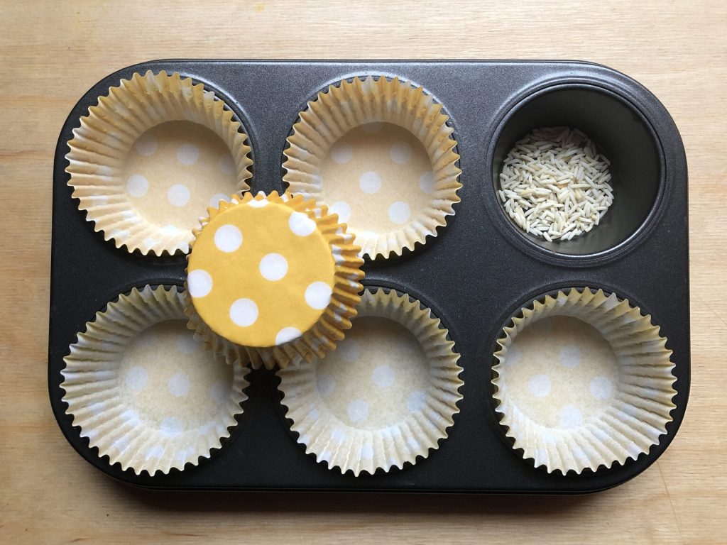 • Distribuye un poco de arroz en el fondo de cada cavidad del molde para muffins. Este es un pequeño truco que nos permitirá mantener limpio el fondo de cada muffin, ya que la masa no dejará grasa ni humedad en el papel. Naturalmente, si usas cápsulas de silicona puedes evitar este paso.
