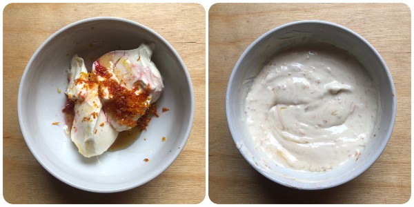 • Pon en un bol pequeño el queso crema, una cucharada de ralladura de naranja, una cucharadita de zumo de naranja y una cucharada de miel. Mezcla suavemente hasta obtener una crema lisa.