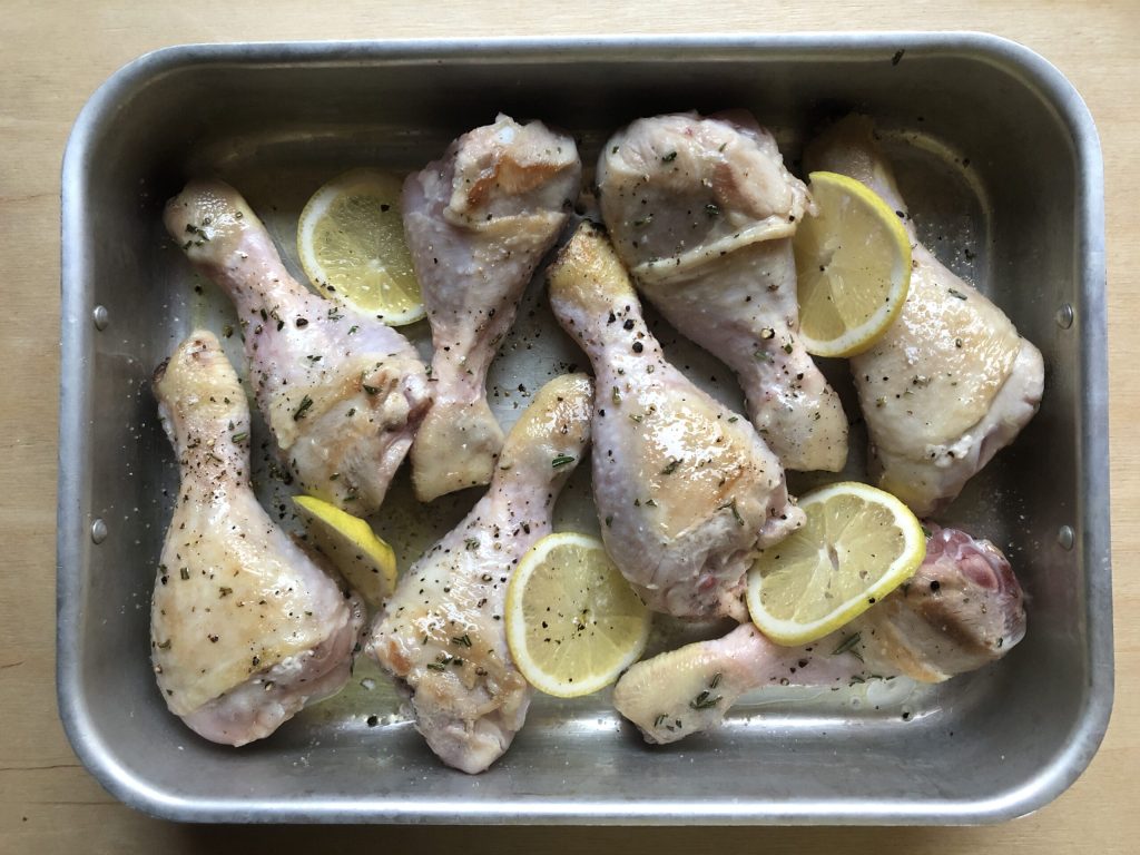 Luego transferirlos a una bandeja de horno previamente engrasada con aceite e insertar aquí y allá las rodajas de medio limón. Después condimentarlos con un poco de aceite, el jugo de la otra mitad del limón, un par de generosas pizcas de sal y una abundante molienda de pimienta negra.