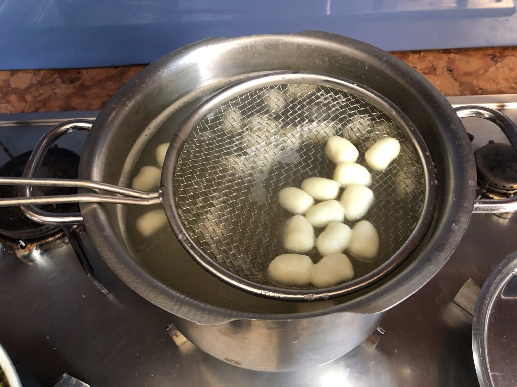 Mientras tanto, echar los ñoquis en agua hirviendo con sal y sacarlos con una espumadera a medida que suban a la superficie.