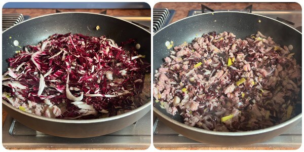 Distribuir el orzotto con salchicha y achicoria en platos individuales y servirlo tanto caliente como a temperatura ambiente. ¡Que lo disfrutes! Paola