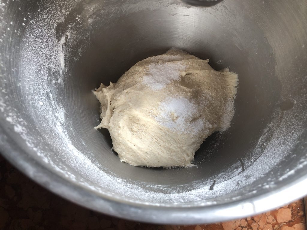 Trabajar la masa durante un buen rato hasta que la sal esté perfectamente incorporada, luego transferirla a la tabla de amasar, formar una bola y colocarla dentro de un bol ligeramente aceitado.