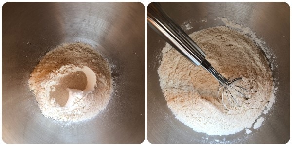 Poner la harina en el cuenco de la amasadora junto con la levadura y mezclar con un pequeño batidor de mano. Si amasáis a mano, tamizad la harina a través de un colador de malla fina.