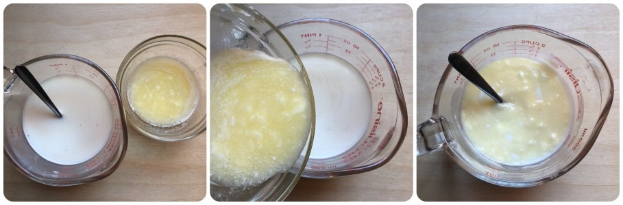 Calentar ligeramente la leche, añadir el azúcar, la sal y la mantequilla previamente derretida en el microondas o al baño maría y mezclar bien. Os aconsejo empezar con 250 ml de leche y añadir más solo si la masa resulta dura. La absorción depende mucho de la calidad de la harina utilizada.