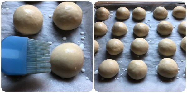 Disponer las bolitas poco a poco en la bandeja forrada con papel de horno manteniéndolas un poco separadas entre sí porque fermentando y cocinando aumentarán de volumen. Cubrirlas con un paño y dejarlas fermentar de nuevo durante otras 2/3 horas.