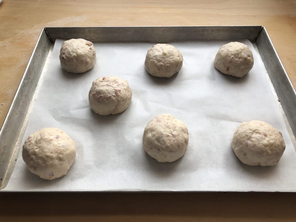 Formar una bolita con cada pieza y colocarlas, una a una, en una bandeja cubierta con papel de horno.