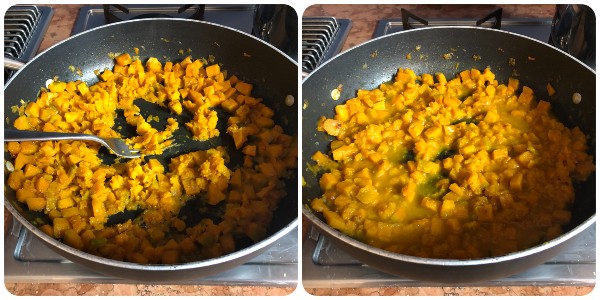 Sala al gusto y cuece durante unos diez minutos, removiendo a menudo y añadiendo unas cucharadas de agua caliente si fuera necesario. Al final de la cocción los dados deberán quedar blandos pero todavía ligeramente crujientes.