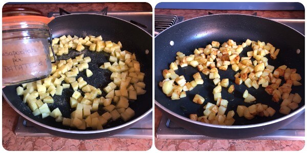 Luego, en una cacerola grande, dorarlas a fuego medio en unas cucharadas de aceite, removiéndolas a menudo. Yo las espolvoreé con mi sazonador para patatas; si no queréis prepararlo, podéis usar el que prefiráis. Cuando estén bien doradas (tomará unos 10 minutos), retirarlas de la cacerola y mantenerlas calientes.