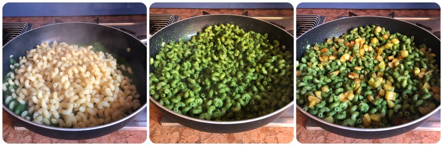 Mientras tanto, cocer la pasta en abundante agua hirviendo con sal, escurrirla al dente conservando un poco de agua y transferirla a la cacerola del condimento. Mezclar bien para amalgamar todos los ingredientes. Finalmente, añadir los cubitos de patatas. En este punto, yo ya no mezclé más para mantener las patatas de su color, creando un bonito contraste cromático.