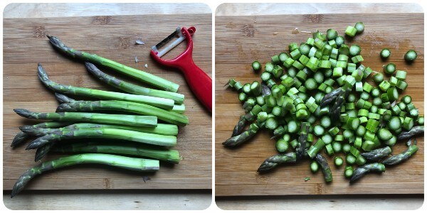 Limpiar los espárragos eliminando la parte final del tallo, la más dura. Luego, con un pelador de patatas, quitar la fina capa exterior del tallo. Después, lavarlos y cortarlos en trozos manteniendo las puntas enteras.