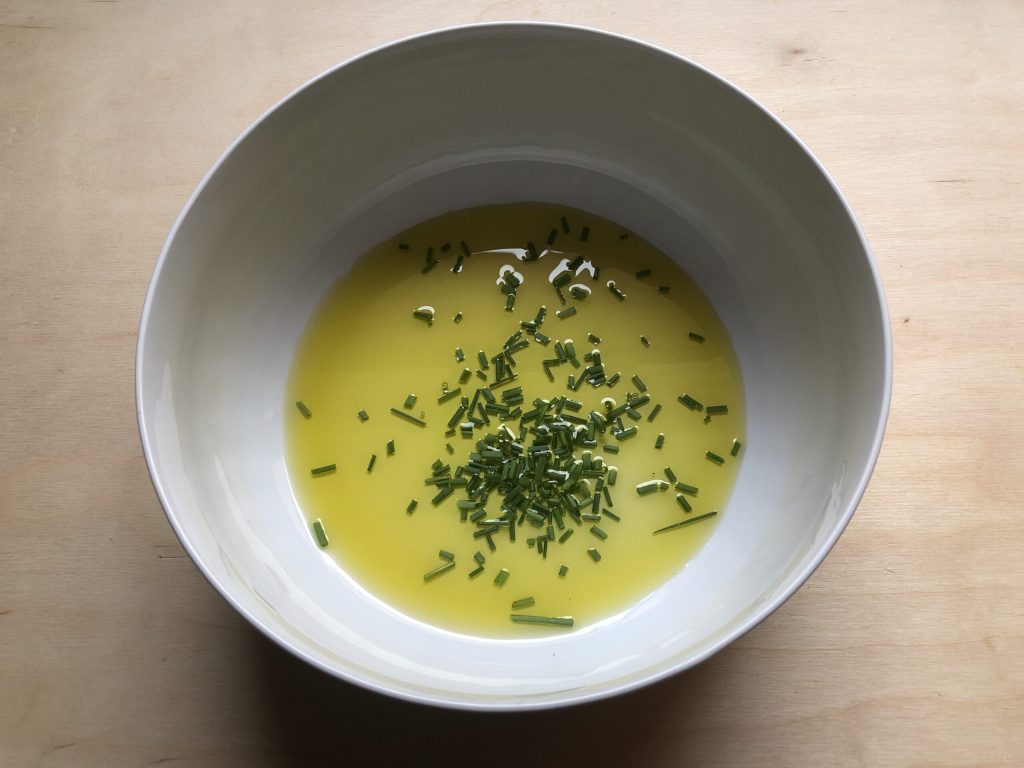 Lavar el cebollino y cortarlo con las tijeras dejándolo caer dentro del bol.