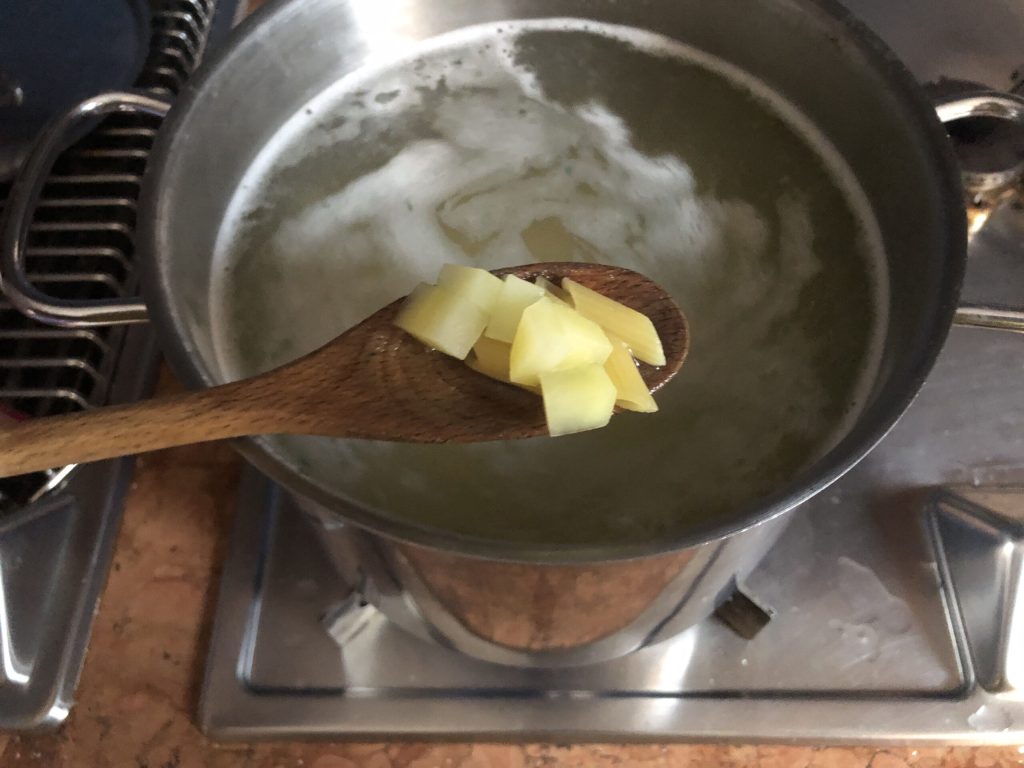 Mientras tanto, pelar las patatas, lavarlas y cortarlas en pequeños cubos. Luego ponerlas en un bol lleno de agua para que no se oscurezcan.