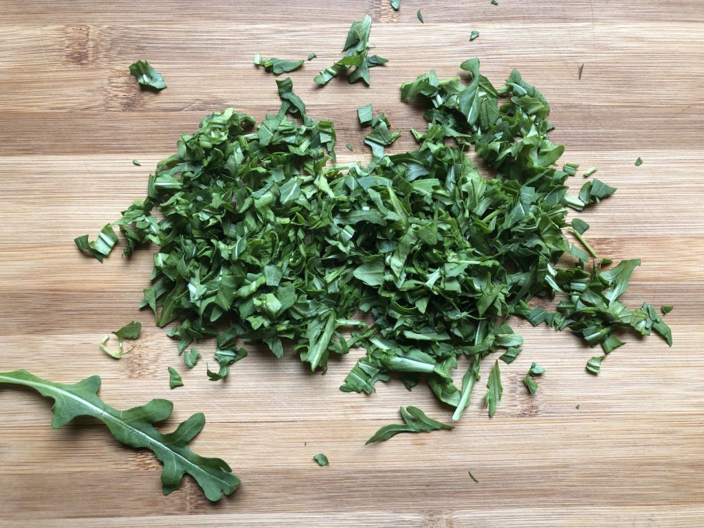 • Lavar las hojas de rúcula, secarlas tamponándolas con papel de cocina (o con una centrifugadora de ensaladas) y cortarlas groseramente. Reservarlas.