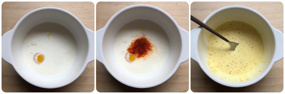 • Colocar las dos yemas en un bol, agregar la nata y el azafrán y mezclar bien batiendo con un tenedor.