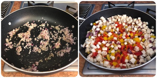 En una cazuela grande, calentar unas cucharadas de aceite y sofreír la cebolla. Dejarla chisporrotear unos instantes, luego añadir los pimientos y las berenjenas.