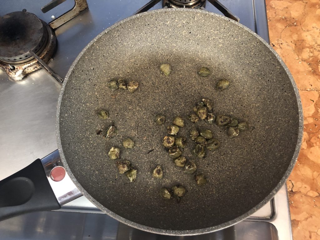 • En la misma sartén, saltear en seco las alcaparras hasta que se vuelvan crujientes: enjuagarlas antes bajo agua corriente y secarlas, secándolas con papel de cocina.