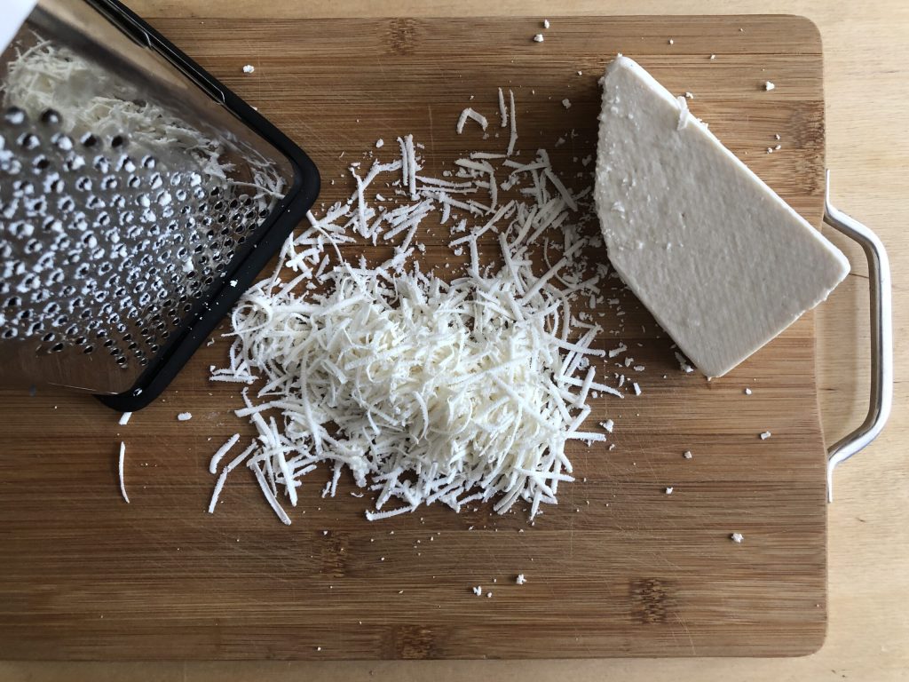 • Rallar la ricotta curada con un rallador de agujeros grandes.