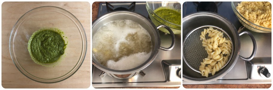 • Mientras tanto, cocer la pasta en abundante agua hirviendo salada, escurrirla al dente con una espumadera y trasladarla directamente dentro de una amplia ensaladera en la que ya se habrá puesto el pesto (de este modo se llevará un poco de agua de cocción).